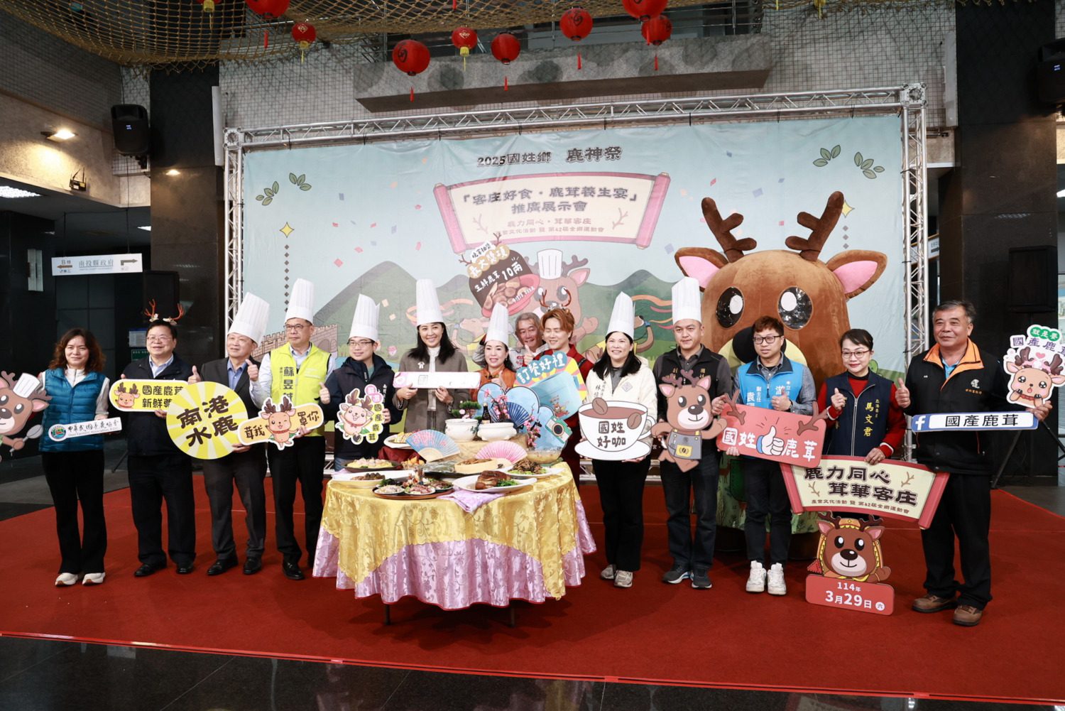 即將在29日晚會中演出的藝人陳孟賢也出席記者會,除演唱歌曲外並與國姓鄉公所吉祥物「朕鹿玩」一起上場亮相,而負責此次養生宴的主廚潘岱儒也上場介紹此次桌餐的菜名與特色,將鹿茸及地方特產梅子、咖啡等入菜,展現出最在地的限定鹿茸及客庄美食。包括縣議員蘇昱誠、林憶如、林儒暘、國姓鄉代表會副主席謝佛青等貴賓亦到場共襄盛舉。