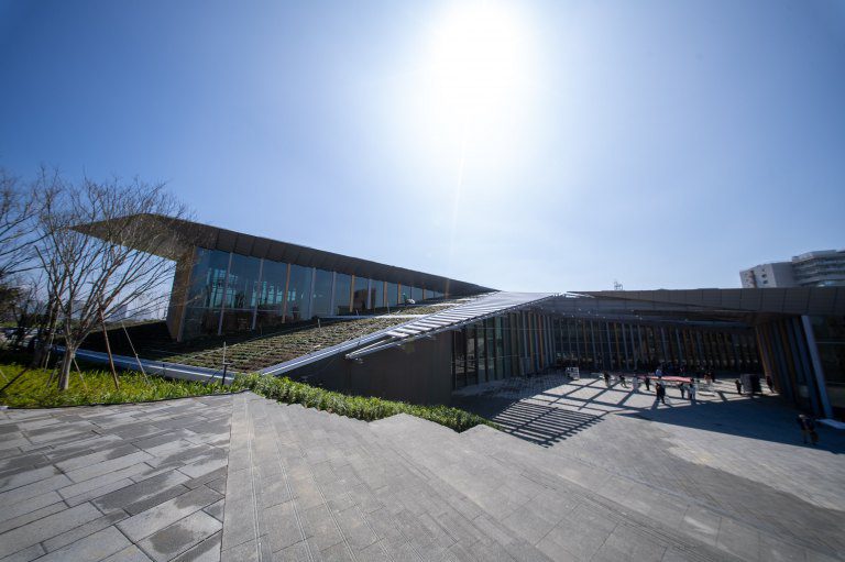▲國際大師隈研吾設計全臺唯一校園地景建築,逢甲大學共善樓落成。(圖/蕭任峰攝)