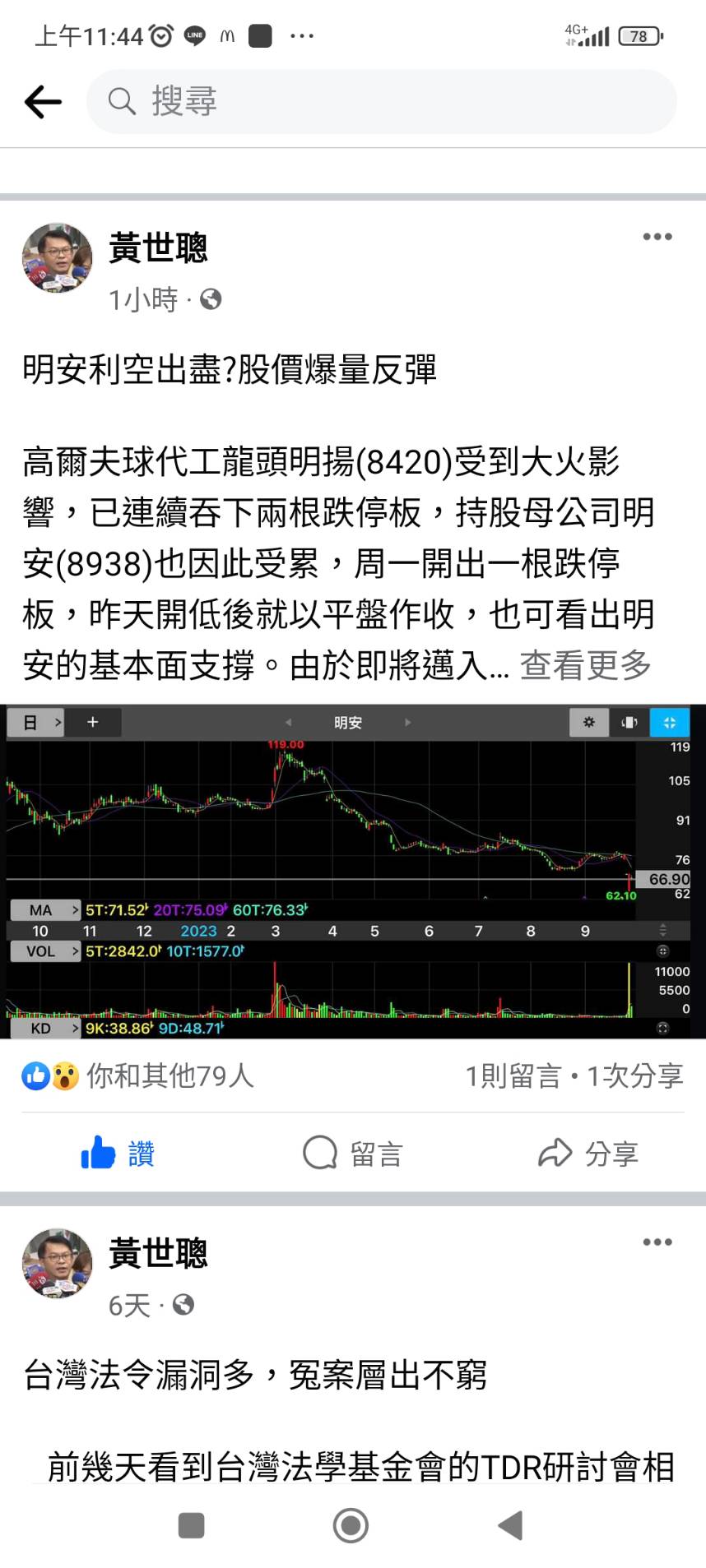 財經專家黃世聰在臉書分析,高爾夫球代工龍頭明揚因為全面停工,今年業績絕對受重大影響,持股母公司明安也因此受累;不過明安昨天開低後就以平盤作收,總計成交1萬多張,今天開盤小跌但也有投資人陸續進場,明安的基本面有支撐。由於即將邁入高爾夫球出貨旺季,可看出不少人趁低點買進明安,低檔出現換手跡象。