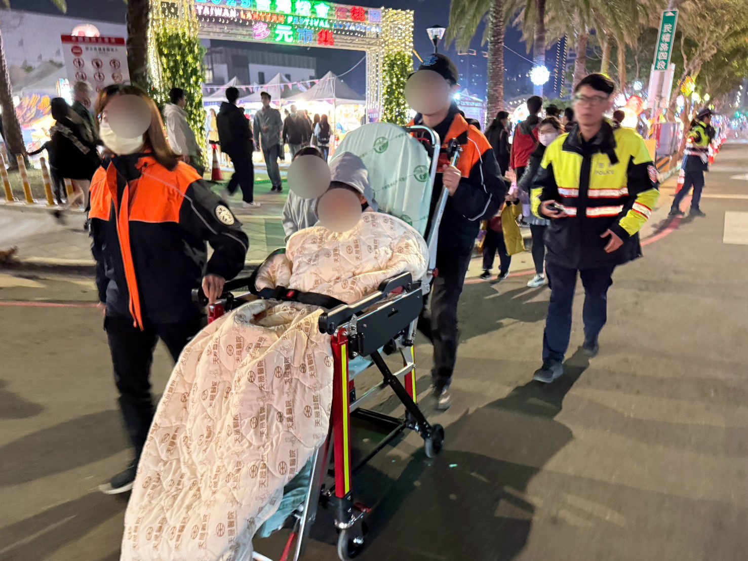 警方表示,昨日台灣燈會湧入數十萬人潮,各個燈區滿滿人潮,員警在各路口交通管制,提領小燈籠的地方排滿滿人龍,員警還協助主辦單位維持秩序,晚間在城市聚光多元燈展區多元市集旁有OPEN將玩偶,引起許多孩童圍繞搶拍照,一名10歲男童不慎被固定繩絆倒膝蓋擦挫傷,家長送小孩醫護站治療雙膝蓋,男孩右手肩膀疼痛舉不起來,建議至醫院檢查,但人潮太多車輛開不出去,男家長將自小客車開至A19站對面車道,男童坐擔架由醫護人員推,員警負責開道引導至500公尺處機場捷運A19站前坐上家長的車輛至醫院檢查傷勢。