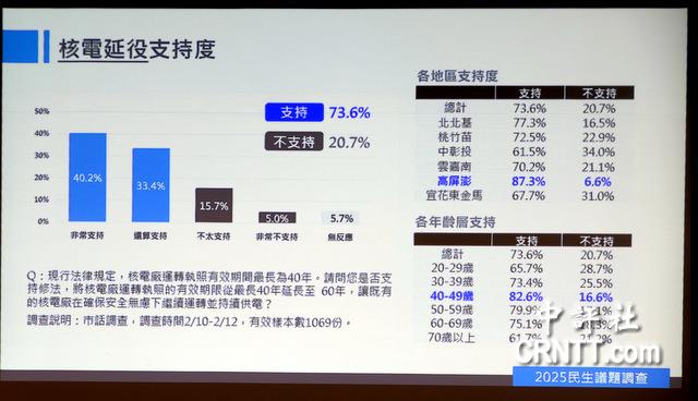 中國國民黨智庫國政基金會今日召開能源政策民調記者會,在核能延役部分有7成3的民眾支持,衹有2成民眾不支持。國民黨主席朱立倫表示,國民黨在立法院新會期將推動修正“電業法”,成立一個獨立專業的能源監督委員會,修正“核子反應器管制法”將核電廠使用年限從40年延長為60年,並且修法把現行的“非核家園”政策修改為“非碳家園”。 此外,朱立倫說,台灣已經討論核電延役很久,國民黨團在上會期就已經提出討論,台灣今年5月將面對核三廠停役,許多學者專家都在警示台灣缺電嚴重,產業界也非常憂心,因此國民黨會盡快協商修正“核子反應器管制法”,將核電廠使用年限從40年延長為60年。 國政基金會今天召開“2025民生議題調查系列:能源政策民調發布會”,包括擔任智庫董事長的朱立倫、國民黨立法院黨團書記長王鴻薇、立委兼智庫執行長柯志恩、智庫經濟財政組召集人林祖嘉、教文體育組召集人陳學聖、永續發展組召集人陳宜民等人出席。 柯志恩指出,根據智庫近日委外所做民調結果顯示,有7成7的民眾支持成立獨立專業的能源監督委員會,衹有1成2的民眾不支持,在核能延役部分有7成3的人支持,衹有2成民眾不支持,至於“非核家園”改為“非碳家園”則有5成7的人支持,2成5的民眾不支持。 ![]() 朱立倫表示,立法院新會期國民黨將推動民生法案,所有牽涉修法的問題,都會先做民調並邀請學者專家一起討論後,再推動修法,今天先公布能源議題的民調,本周四還要針對長照保險公布民調,下周還會多次公布民生政策與相關議題的民調結果,國民黨中央與黨團、智庫將會密切合作,一一推動民生議題的政策。 朱立倫指出,今年是AI關鍵年,也是貿易戰的關鍵年,全世界都在拼AI與貿易,台灣的執政黨卻在拼大罷免與政治,但國民黨還是要回歸民生。他說,美國總統特朗普已經宣布要成立獨立的能源主導委員會,面對AI挑戰,美國政府知道未來電力就是國力與AI戰的關鍵,而且發展AI需要的電力可能是現在電力的2倍,台灣沒有像美國有礦產與能源,必須依靠進口、核能與綠電,現在美國已經停止風電發展,而是靠礦業、自產能源。 朱立倫強調,台灣如何面對挑戰,國民黨提出幾項關鍵政策,包括現階段是經濟部下屬三級機關的能源局負責主導能源管理,完全只能聽命中央主導政策,不論在能源監理管理以及一些可能問題的防弊、揭弊,能源局都無法獨立運行,因此國民黨主張修改“電業法”,成立獨立專業的能源監督委員會,針對外界疑慮解決問題。 朱立倫也強調,全世界面對現階段氣候變遷的挑戰,都是希望能達到減碳、淨零排放與無煤減碳,“非核家園”是過去的主張,現在應該改走“非碳家園”,而且從非核走向非碳也是世界趨勢,面對AI發展的重要因素。 |