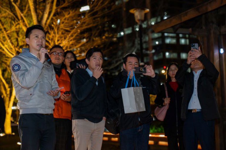 ▲竹北光節網路熱議譽為仙境,吸引中華民國工業設計協會理事長張漢寧(左1)、日本工業設計公司GK Kyoto 麻田風兒社長(左2)等人特地前來參訪。(圖/記者蔣彤雲攝)