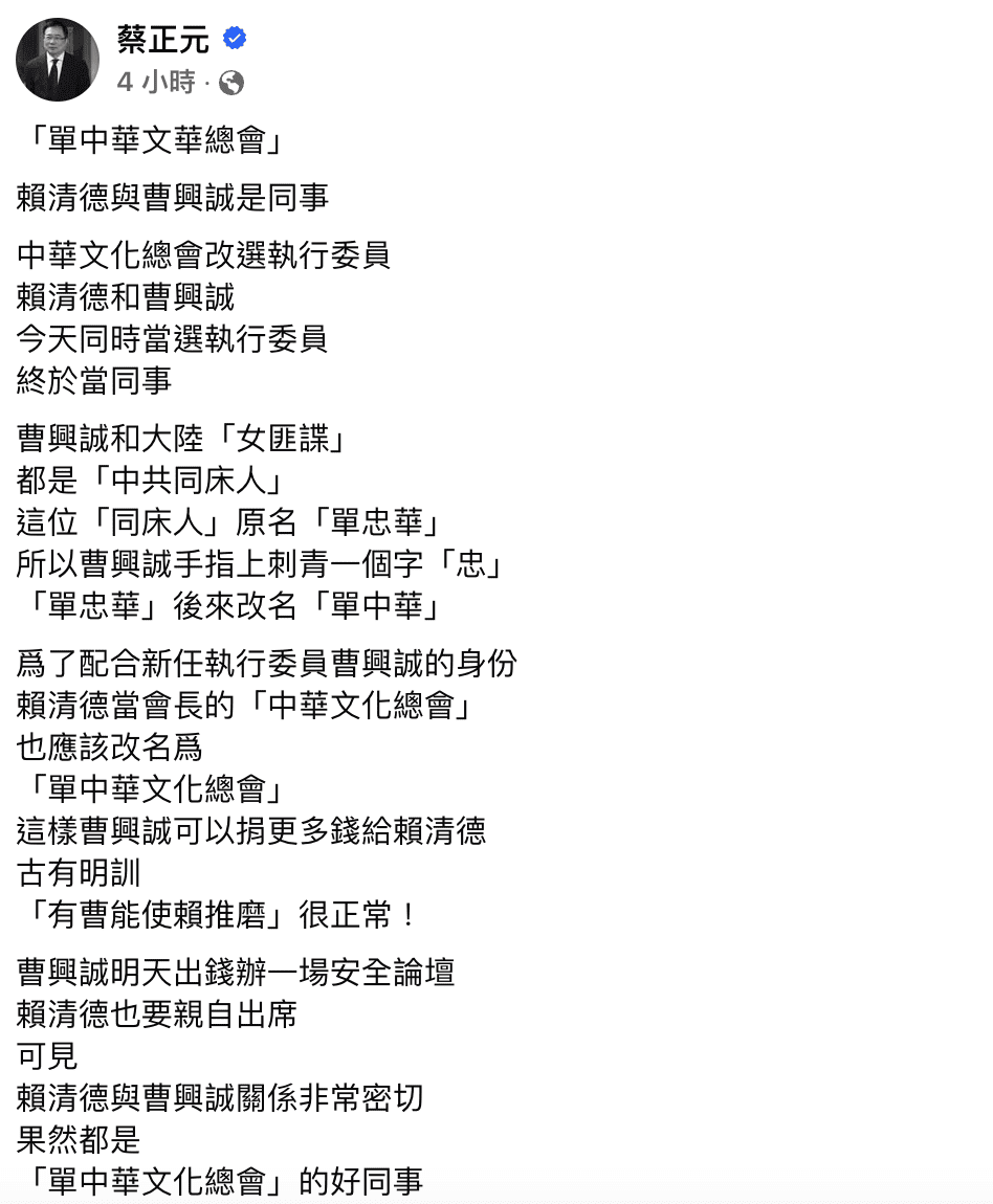 蔡正元在臉書發文嘲諷,賴清德與曹興誠「終於當同事」,並聲稱曹興誠與大陸「女匪諜」是「中共同床人」,這位「同床人」原名「單忠華」,所以曹興誠手指上刺青「忠」字。蔡還調侃道:「有曹能使賴推磨」,暗指賴清德與曹興誠關係密切,並指出曹興誠明天出錢辦安全論壇,賴清德也將親自出席,可見兩人「都是單中華文化總會的好同事」。