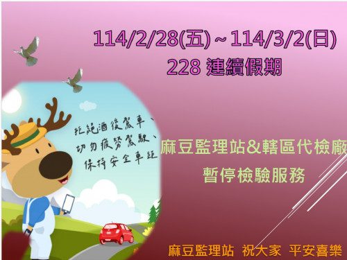 228連假暫停車輛檢驗服務,請提早辦理車輛檢驗。