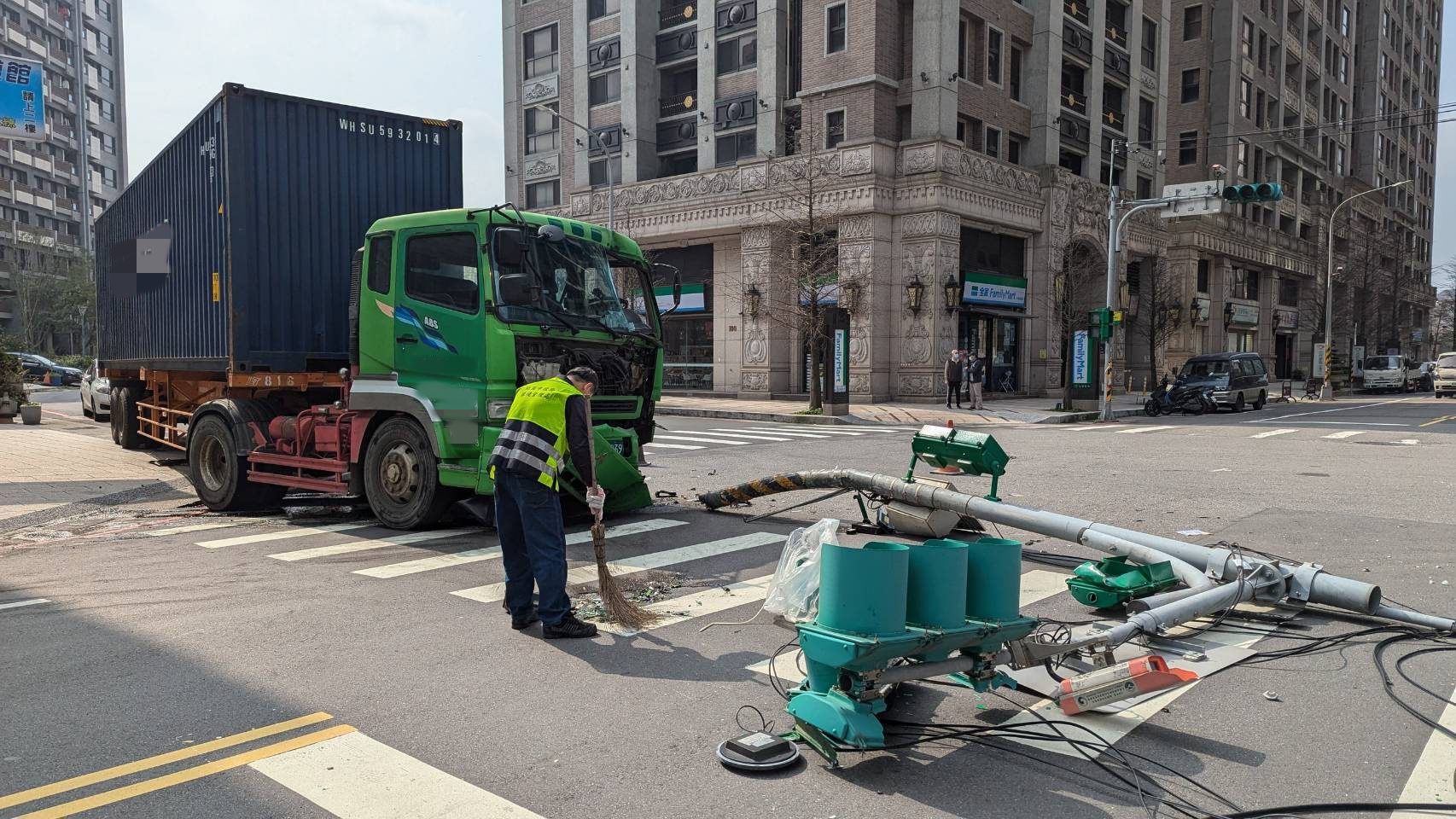 桃園市中壢區今(20)日上午9時許有紅綠燈號誌遭撞倒橫躺在路中央。中壢警分局表示,44歲呂姓男子當時駕駛營業曳引車沿松勇路往高鐵南路方向直行,在松勇路與松義路口疑似因爆胎失控,先撞上路邊廣告招牌,再撞到紅綠燈號誌,導致紅綠燈橫躺在馬路中,所幸沒有砸到往來的人車。