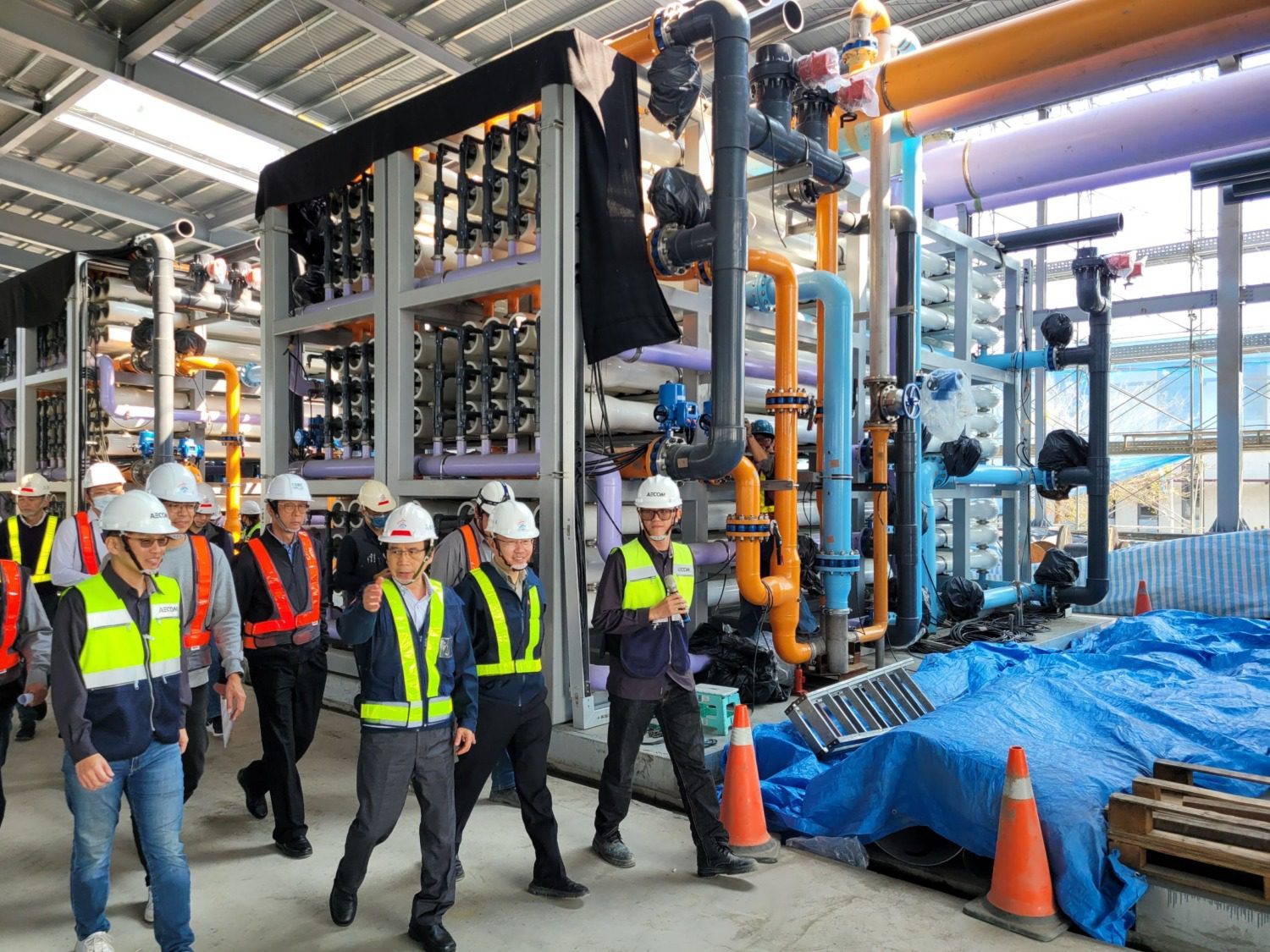 林副市長表示,橋頭再生水廠完工後,將每日生產3.5萬噸再生水,供應至楠梓產業園區,為台積電提供穩定可靠的優質水資源,同時降低對自來水的依賴,推動水資源循環利用。該工程採用生物薄膜處理系統(MBR)與海水淡化逆滲透膜(SWRO)兩大先進技術,不僅能有效過濾微粒及有機污染物,更在脫鹽與除硼方面達到半導體產業的嚴格標準,確保再生水水質穩定且純淨。