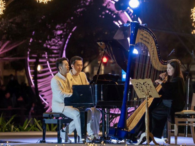 星光場的「水上音樂會」,以天為幕、以地為席、以樹與燈光為景,木棧灣區與改良後的低光廊道成為市民共賞音樂的最佳區域,邀請國家交響樂團(NSO)豎琴首席解瑄、古典鋼琴演奏家嚴俊傑,攜手興隆國小弦樂團