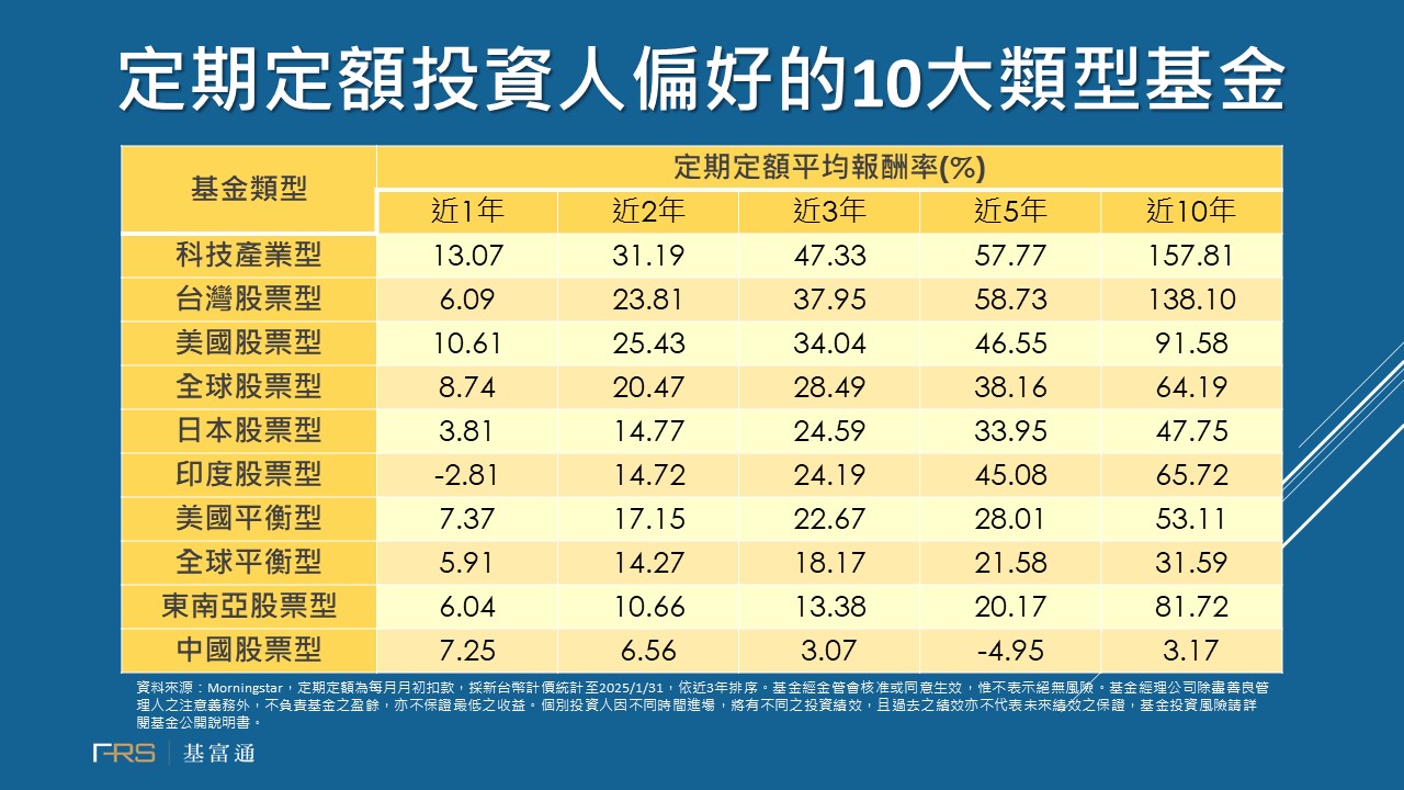 此外,基富通發現,定期定額投資人明顯偏好股票型基金與平衡型基金,尤其是台股和科技產業股票兩大類,合計占6成比重,前10大受青睞的類型還包括美國平衡、印度股票、美國(北美)股票、日本股票、全球平衡、全球股票、東南亞股票與中國股票型基金。