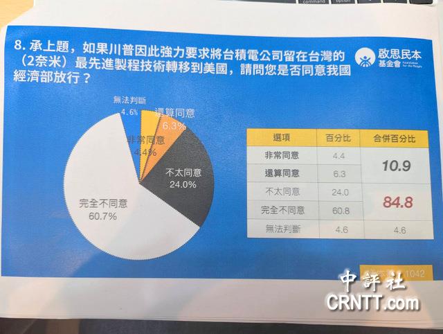 由中國國民黨籍立法院副院長江啟臣擔任董事長的“啟思民本基金會”今日上午召開國際現勢民調發布記者會。民調顯示,高達84.8%的台灣民眾不同意台積電先進製程轉移到美國;同時有高達85.6%認為美國總統川普會對台灣加徵關稅。 啟思民本基金會今日上午召開“啟思民本民調—國際現勢發佈記者會”,主持人為啟思民本基金會董事兼執行長,政治大學外交系教授黃奎博,與談人包括國民黨籍立法院副院長兼啟思民本基金會董事長江啟臣、科克蘭資本公司董事長兼啟思民本基金會顧問楊應超、淡江大學國際事務與戰略研究所所長李大中及國民黨籍立委葛如鈞。 ![]() 調查結果如下: 一,美國川普政府一上任就對加拿大、墨西哥加徵25%關稅,對中國大陸加徵10%,請問台灣是否可能也被特朗普政府以關稅手段施加壓力?85.6%認為有可能,10.7%認為不可能。 二,美國川普政府強調對等、公平的國際貿易秩序,請問當前台美貿易是否符合對等、公平?40.6%認為符合,49%認為不符合。 三、當前台美貿易中,誰比較佔優勢?24.8%認為是台灣,62.4%認為是美國。 四,去年台灣自美國賺取739億美元的順差,創下歷史新高,台灣如果要減少對美貿易順差,可以優先購買哪些美國產品?59.5%認為是軍武;41.6%認為是石化能源及核能;35.4%認為是農產品;12.5%認為是汽車;11.5%認為是電腦及零件。 五,是否同意台積電公司以及台灣半導體產業是台灣“護國神山”?83.8%同意;8.8%不太同意。 六,是否同意台灣半導體產業是“矽盾”?若中國大陸對台動武,切斷半導體供應鏈,美國為首的西方國家將採取軍事干預。62.5%同意,30.8%不同意。 七,是否同意美國總統川普說台灣偷走美國的半導體生意?88.4%不同意,9.5%同意。 八,如果川普強力要求台積電將最新製程例如2奈米轉移到美國,是否同意經濟部放行?84.8%不同意,10.9%同意。 九,面對川普政府壓力,民進黨政府有沒有以台灣利益為優先,積極與美國政府溝通?50%認為有,42.6%認為沒有。 十,未來一年美國與中國大陸的關係會如何變化?13.4%認為變好;37.4%認為與現在差不多;40%認為變差。 此次民調調查對象為20歲以上網路人口,透過Facebook發送問卷,調查時間為2月18日至2月21日,有效樣本為1042份,抽樣誤差在95%信心水準下,為正負3.03%以內。 |