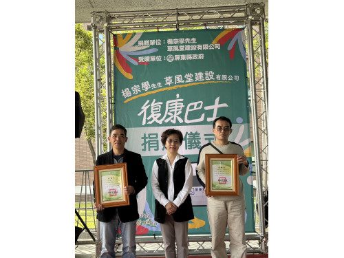 復康巴士是縣內身心障礙朋友最依賴的重要交通運具,楊宗學先生及草風堂建設有限公司於25日上午在屏東縣政府南棟廣場捐贈縣府2輛復康巴士,強化屏東縣復康巴士的服務量能。縣內目前有104輛小復康巴士及2輛旅遊專用復康巴士,每年服務有16萬人次。在縣府與民間的合作下,已累積汰換車齡10年以上復康巴士60餘輛。