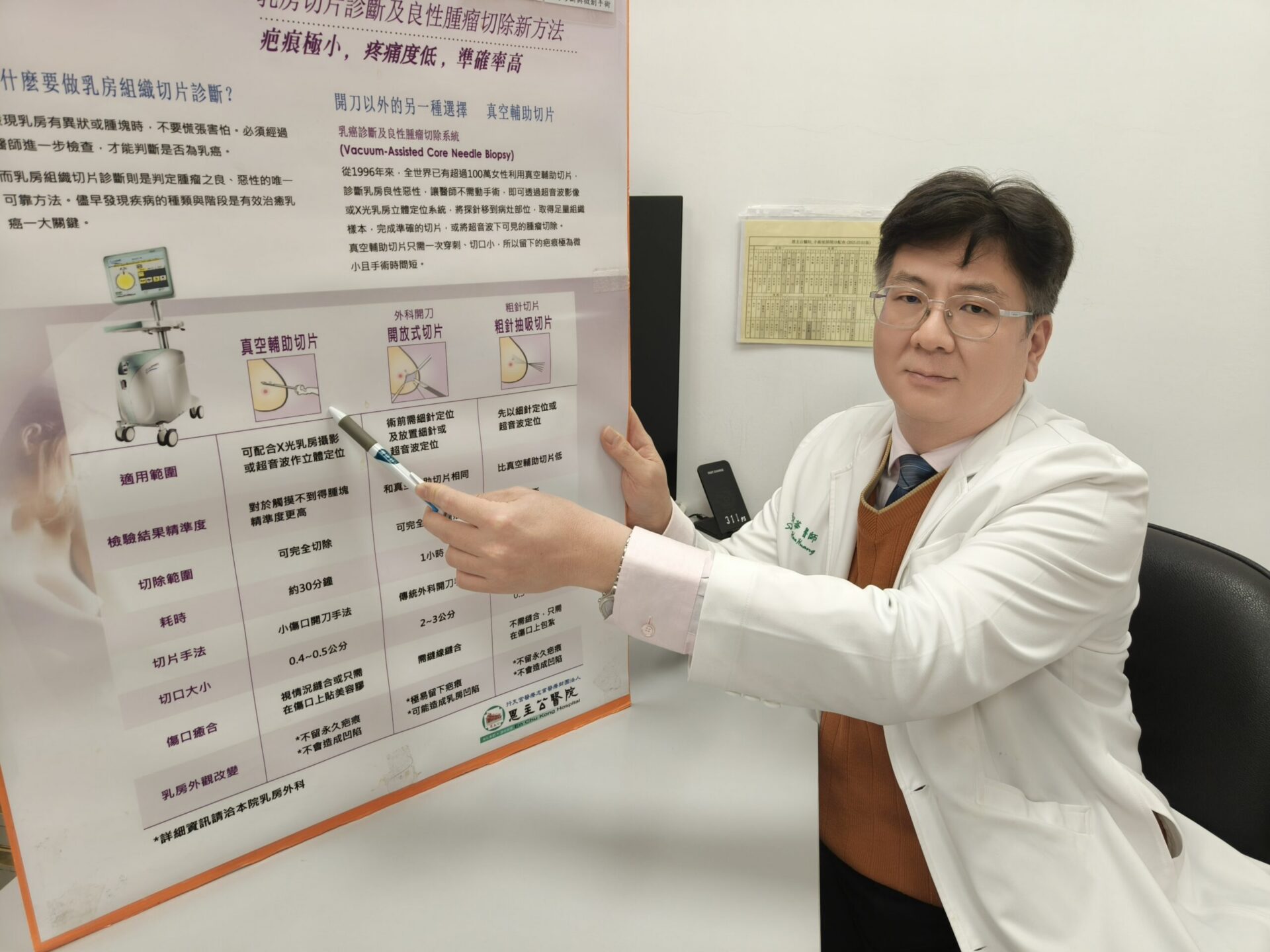 黃星華提到,過去傳統開刀手術切除乳房腫瘤, 患者往往會擔心疤痕過大或乳房變形,影響乳房外觀而遲遲不願進行手術,「真空輔助連續乳房切片微創手術」結合超音波影像導引可精準定位,利用真空抽吸及切片針,將良性腫塊抽吸出來,兼具診斷與治療功能,傷口從傳統手術的2至5公分縮小至0.3至0.5公分,術後的疼痛感大幅下降,患者隔天即可恢復日常生活。黃星華強調,「過去穿刺檢查只能取得部分組織,但真空輔助連續乳房切片微創手術可以完整切除腫瘤,對於三公分的腫瘤,九成以上可切除乾淨,同時減少誤診風險。」