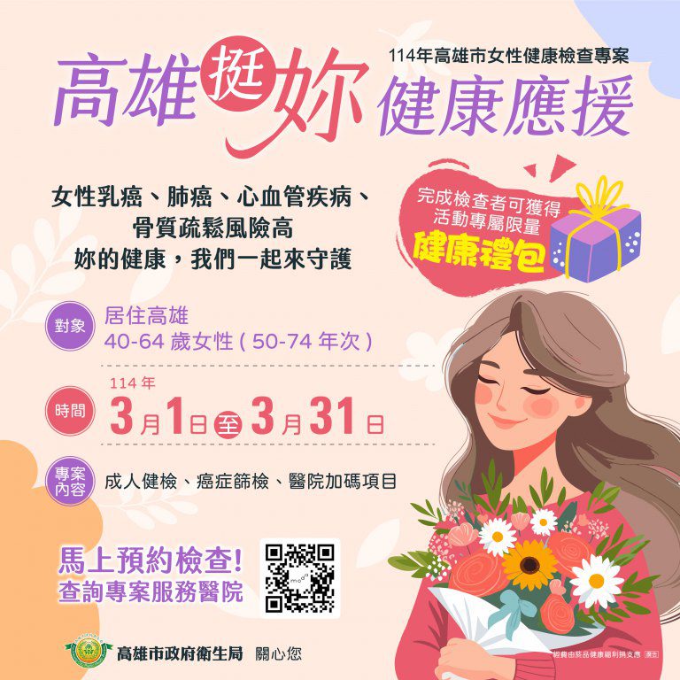 高雄市政府衛生局攜手21家醫療院所共同發起「高雄挺你,健康應援」女性健康檢查專案活動,活動時間於114年3月1日至31日止,旨在提升女性健康意識,鼓勵終日忙碌於家庭與工作兩頭燒的女性朋友們,定期接受健康檢查,照顧自身健康。