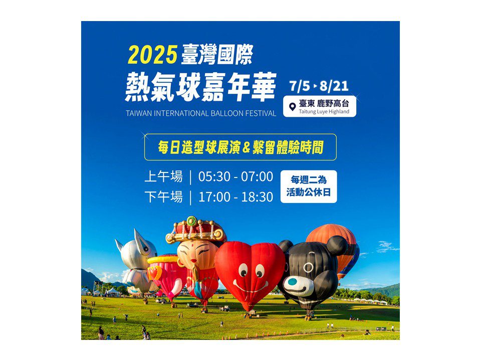 台東縣政府特別說明,歷年來熱氣球活動幾乎都是以每日不間斷的方式進行展演,今年熱氣球團隊為了更完善執行所有光雕音樂會前置作業,活動期間「每週二」將設為公休日,另外現場造型熱氣球展演及繫留活動,每日分上午場和下午場兩個時段,時間分別為上午05:30-07:00及下午05:00-06:30,請球粉們留意活動日期及時間的安排,更多活動的最新資訊,民眾可前往2025臺灣國際熱氣球嘉年華的官網或FB粉絲專頁查詢。