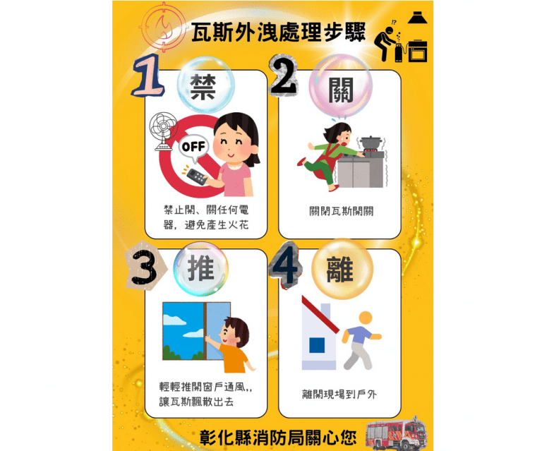 ▲當家中或周圍出現瓦斯異味時,請保持冷靜,彰化縣消防局提醒,遵循「禁、關、推、離」4步驟就能遠離氣爆危機。(圖╱彰化縣政府提供)