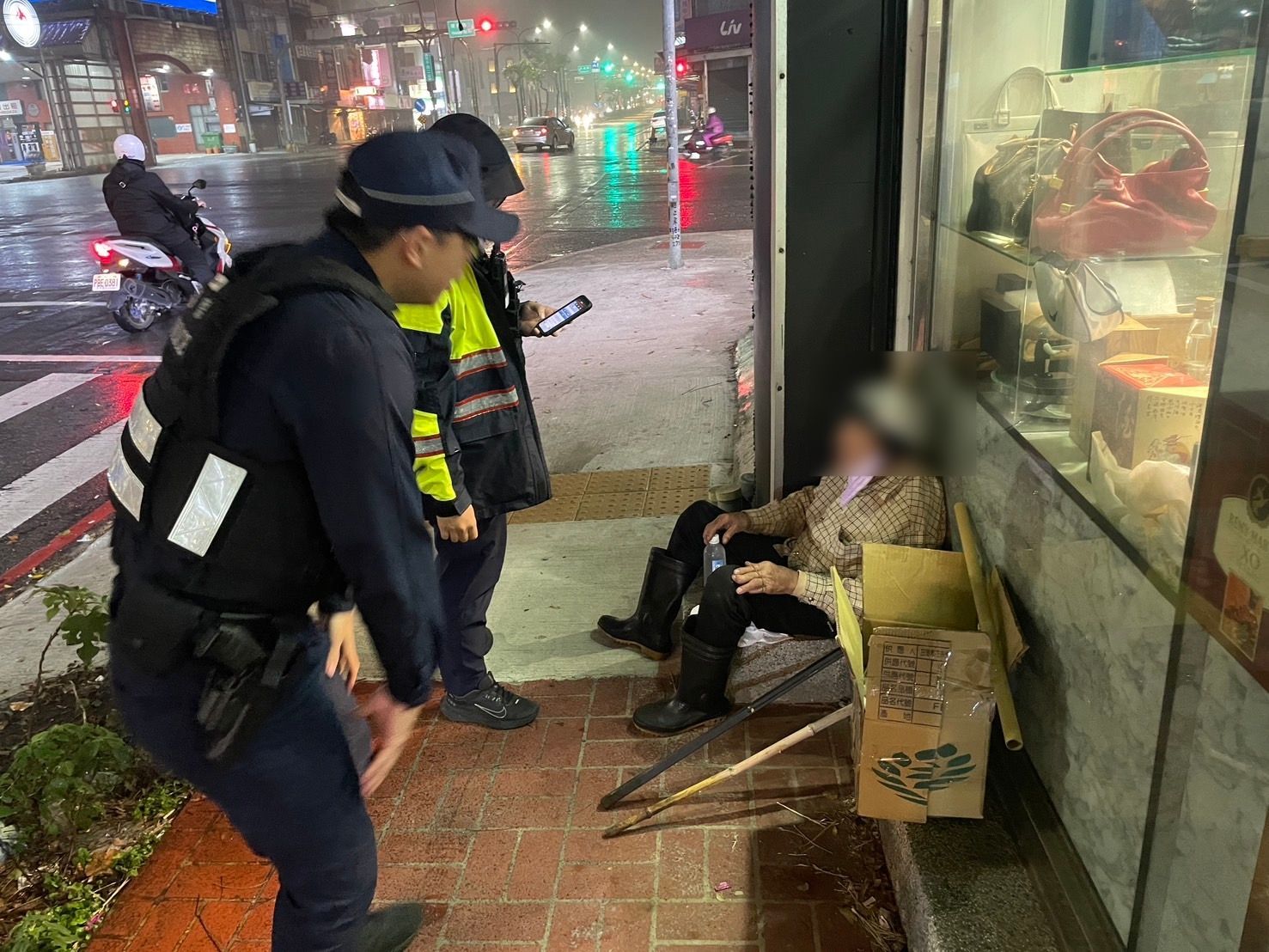 宋屋派出所副所長鄭力行表示,家住中壢區,患有失智症的老翁昨日傍晚趁家人不注意獨自外出,家人誤以為他在房內休息,直到晚餐時間才驚覺老翁不在,全家隨即外出尋找,無奈苦尋未果,也急得向當地派出所報案求助。恰巧鄭力行、警員余政鋌及鄧安志巡邏行經平鎮區延平路與環南路口時,眼尖地發現一名老翁戴著安全帽,蜷縮在人行道旁,狼狽地躲避傾盆大雨。員警見狀立即停下車輛上前關心。但老翁面對詢問,卻難以清楚表達自身情況。考量到老翁的狀況,於是決定先將他帶回派出所安置,確保其安全。