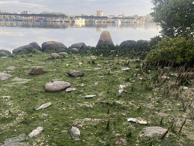 ▲港濱歷史公園岸邊魚屍紅樹林裡面垃圾應清理。(圖/記者吳玉惠翻攝)