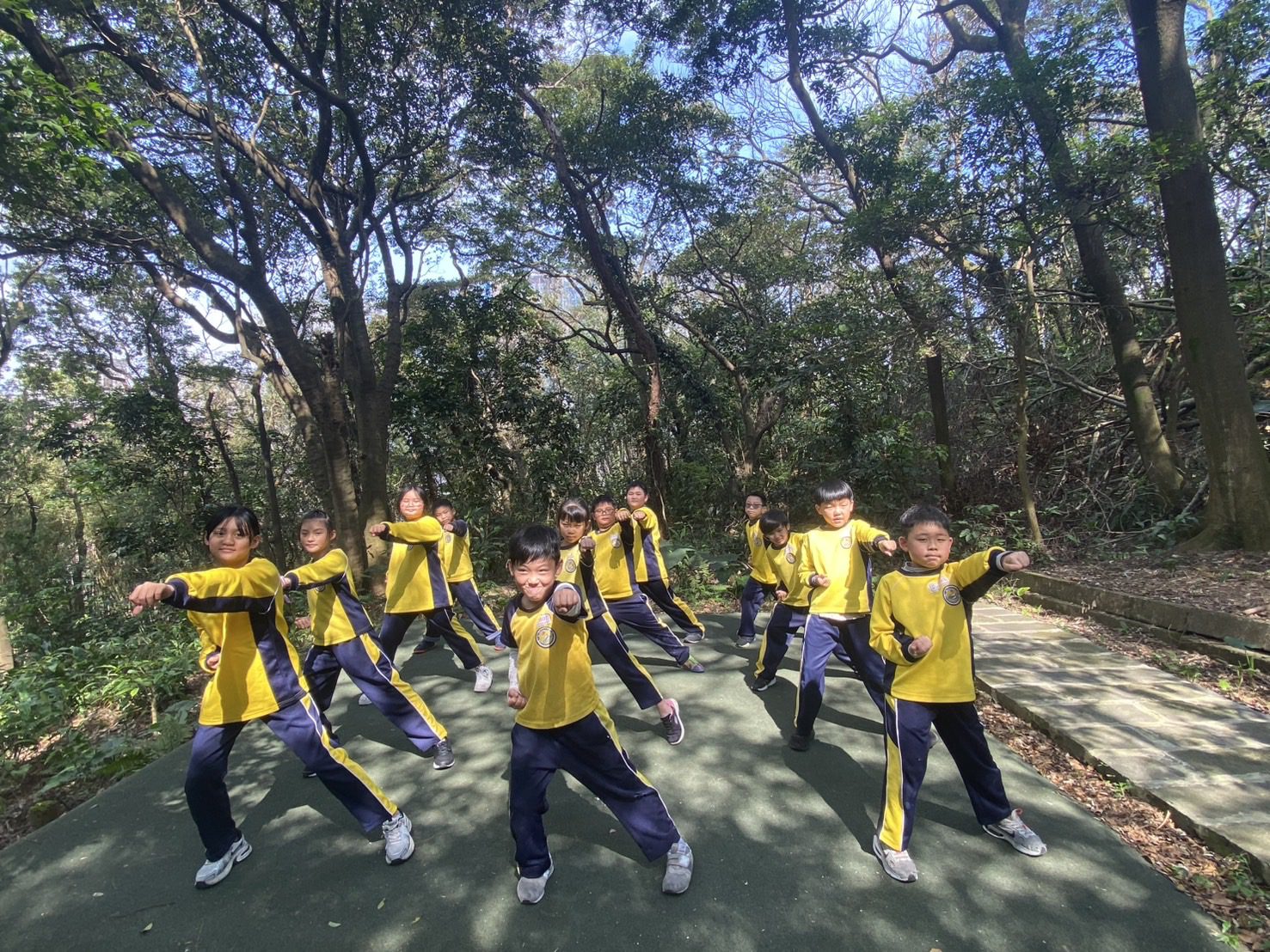 過程中老師激勵著孩子們,只見部分孩子手插著腰氣喘吁吁的停在步道中途,倚靠著欄杆說,「老師,我們可以先休息一下嗎?」果然,寒假過完年,孩子們身上增胖不少,體能也下滑,為了消耗掉多餘的熱量,恢復健康體態,趁這次好好進行「甩肉計畫」,這個機會再好也不過了。到達後山平台,孩子們便開始進行健康操練習。