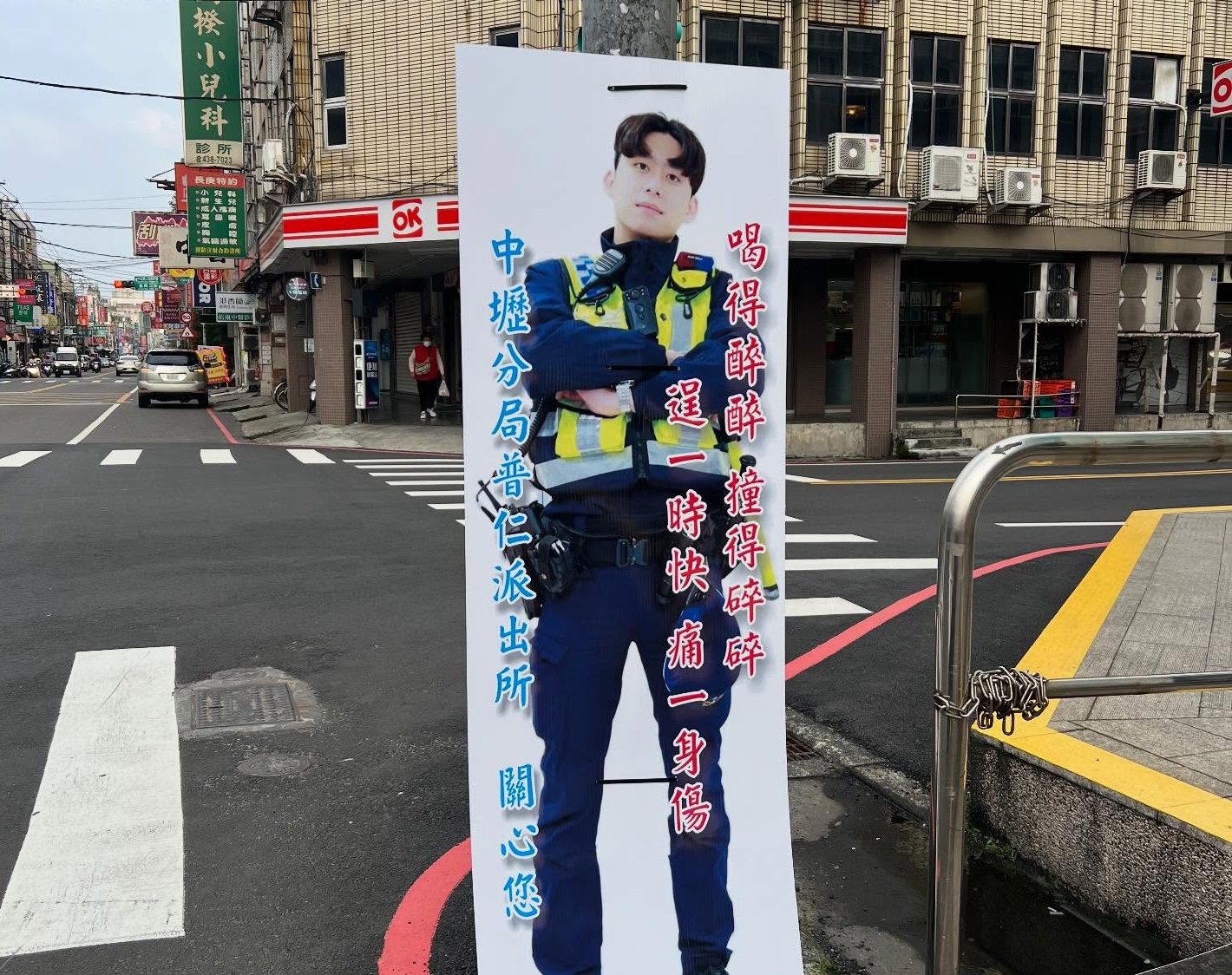 有網友在threads發文表示,「這人到底是誰 ?一直出現在中壢街道上」。從貼文附上的照片中可以看到,一名帥氣的警察被印在巨大的立牌上,上面印著標語「「喝得醉醉,撞得碎碎」」,提醒民眾不要酒駕。原來,這是普仁派出所試辦在轄內車流量大及交通事故率較高之路段及路口,擺放醒目之交通安全、犯罪預防宣導廣告看板來提醒民眾,除了酒駕防制宣導外,也有「小心車手陷阱,守護你的財產」反詐騙宣導版本。