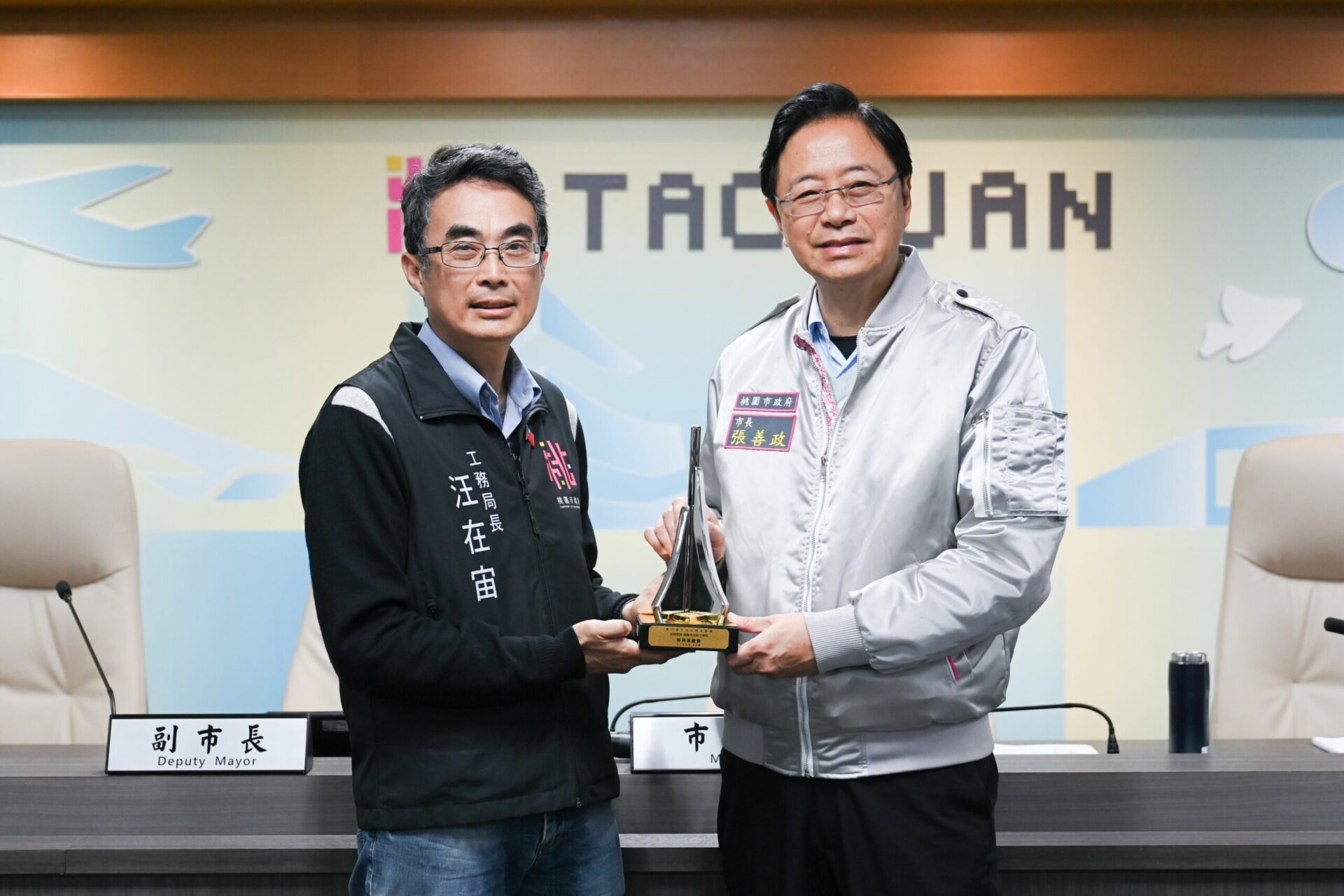 桃園市長張善政今(5)日上午主持市政會議,接受工務局呈獻榮獲行政院公共工程委員會「第24屆公共工程金質獎」。張善政表示,此次獲獎展現市府對工程品質的高度要求,地面上的建設除兼顧美觀與實用外,對於完工後外觀上看不到的地下管線、捷運地下工程等,更需確保施工品質,市府將持續推動優質公共建設,為市民提供更舒適便利的環境。