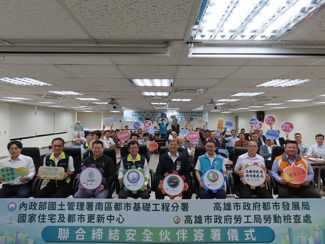 【今傳媒/記者李祖東報導】高雄市勞檢處為預防營建工程職業災害,攜手高雄市都發局、內政部國土署南工分署、國家住都中心,於(5)日上午在南工分署會議室,由勞檢處郭清吉處長、都發局陳明軒總工程司、南工分署林敬賢分署長、住都中心董世寧副執行長,共同代表簽署締結為安全伙伴。勞工局江健興局長、營造業南區職業安全衛生促進會張昭鎮會長,與相關工程單位及承攬廠商代表,亦受邀到場見證,期盼彼此能透過安全伙伴的合作關係,以「尊重生命、以人為本」為核心價值,進一步密切串聯地方與中央的資源及力量,擴大工安防禦網,督促各營建工程工地重視職場安全,為降低職業災害,及營造安全新形象而努力,共同保障勞工朋友安全健康。