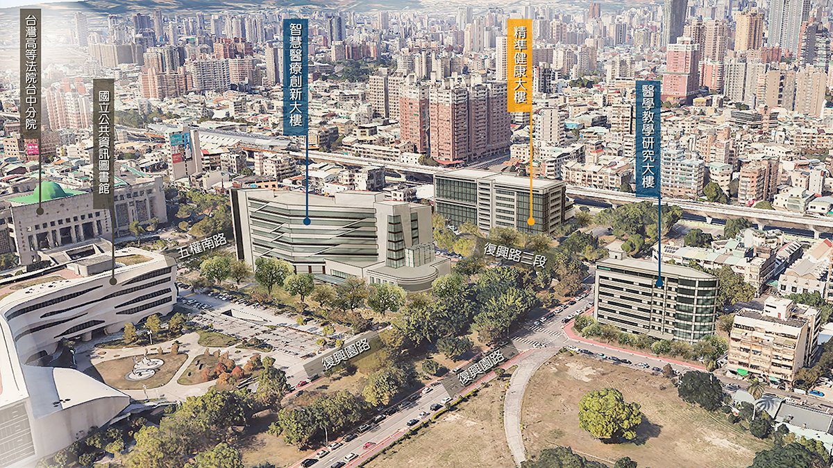 興大復興校區位於五權南路與復興路三段,占地2.39公頃,鄰近五權車站及國立公共資訊圖書館,規劃為智慧醫療園區。此園區將分二期工程進行,第一期包含智慧醫療大樓(即中興大學附設醫院)及醫學教學研究大樓,第二期則興建精準健康大樓。未來若獲衛福部核定床位數,將依政策辦理BOT作業,優先尋求醫學中心級醫院合作,甄選最優對象與最佳方案進行開發。整體開發期程預計十年,第一期目標於2030年完工。