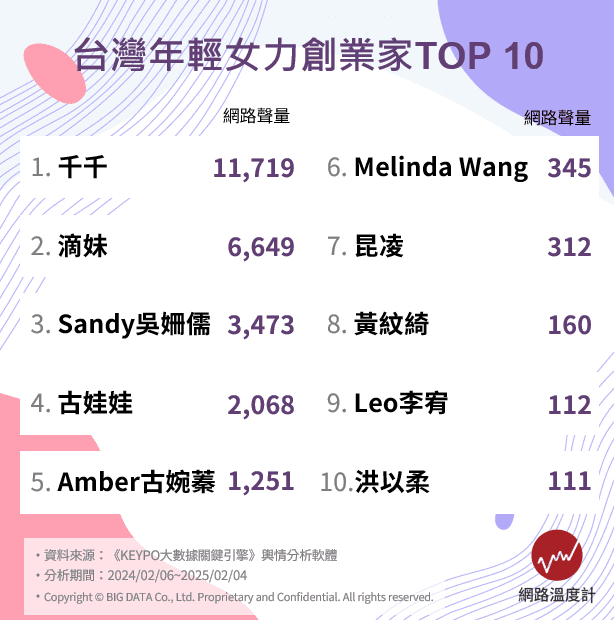 妳知道女性30歲以前創業不再是一件困難的事了嗎?在這個競爭激烈的時代,不少女性創業家嶄露頭角,但要能在市場中殺出重圍、打造年營收破億企業,不僅需要堅定信念、精準策略,還要培養無數次「從哪裡跌倒,就從哪裡爬起來」的精神,通過重重關卡與考驗,才能讓品牌屹立不搖,改寫自己的命運,同時也成為照亮後來者的燈塔。《網路溫度計DailyView》透過《KEYPO大數據關鍵引擎》輿情分析軟體,帶您揭曉35歲以下、品牌創立5年以上的台灣10大女力創業家。