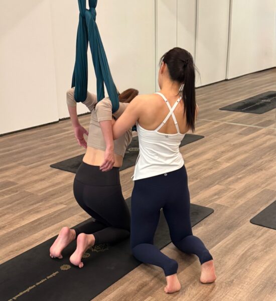 「坐坐瑜珈」課程大致可分三類,第一,適合初學者,專注於基礎伸展與放鬆的地板瑜伽(來來課);第二,結合輔具輕盈延展,增強柔軟度與核心穩定的低空瑜伽(坐坐課)。若瑜伽基礎深厚的學員,可挑戰進階懸吊動作,鍛鍊身體控制力與耐力的高空瑜伽(上上課)。除基礎到進階的課程規劃外,也引入東方經絡與西方皮拉提斯元素拓展課程內容,讓瑜伽不僅是運動,更是一種身心修復與健康管理的方式。