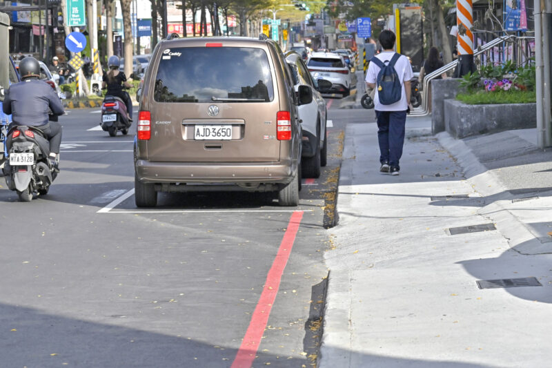 工務局長楊欽富表示,市府為優化活動頻繁地段周邊人行道,持續挹注經費進行有次序的系統性改善,施作換新耐久美觀鋪面,整平人行道排水溝頂板、擴大轉角斜坡以利無障礙通行使用,此外,更整合改善退縮地、配合路外停車格將台電電箱遷移至路上,增加行人淨空間,營造安心順暢的逛街步道。