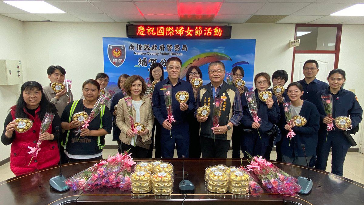 南投縣警察局埔里分局為感謝女性同仁在職場與家庭間的辛勞付出,特於3月8日婦女節舉辦溫馨慰勞活動。分局長林威廷與埔里警友辦事處主任黃瑞啟親自向女性員工致意,並贈送巧克力等小禮物,以表達對她們的敬意與感謝,讓現場洋溢著溫暖與感動。