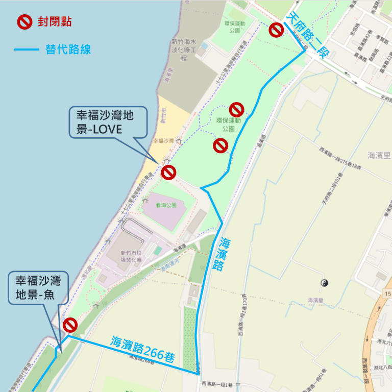 新竹市17公里海岸線風景區是市民及遊客熱愛的休憩場所,為提升整體觀光品質,新竹市政府辦理「新竹17公里地方旅遊環境營造計畫優化工程」,將於3月16日至114年5月16日(遇雨順延),進行天府路二段廣場至幸福沙灣地景-魚區段之鋪面、公廁及導覽系統改善工程,施工期間將封閉該區段自行車道。