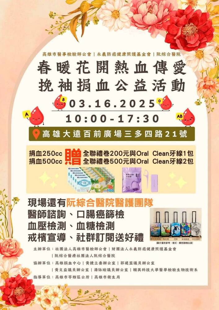有鑑於此,阮綜合社團法人阮綜合醫院與高雄市醫事檢驗師公會,以及永義防癌健康照顧基金會共同發起 春暖花開熱血傳愛挽袖捐血公益活動,將於114年3月16日(星期日) 10:00~17:30 假高雄大遠百前廣場(三多四路21號)舉行。