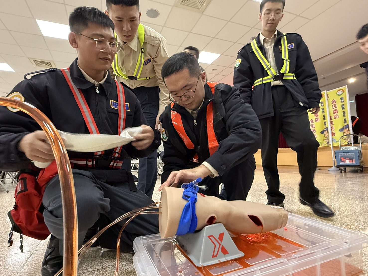 教官柳育漢表示,氣爆現場通常瞬間會出現大量傷病患,課程特別針對「大量傷患檢傷分類」、「燒燙傷處理」及「創傷止血」訓練,透過擬真腿部創傷模型及燒燙傷口貼片,進行包紮與止血演練,讓學員透過真實觸覺與視覺效果,強化臨危不亂的緊急救護能力。