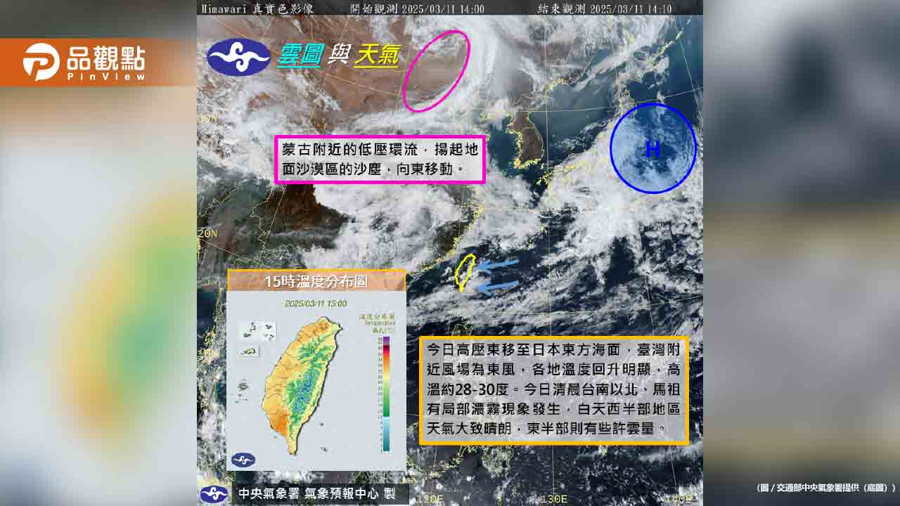 中央氣象署指出,今日全台各地及離島地區大多為多雲到晴的天氣,僅東部、東南部地區有零星短暫陣雨。白天溫暖微熱,各地高溫26至31度,但夜晚清晨稍涼,西半部低溫16到18度,東半部19、20度。