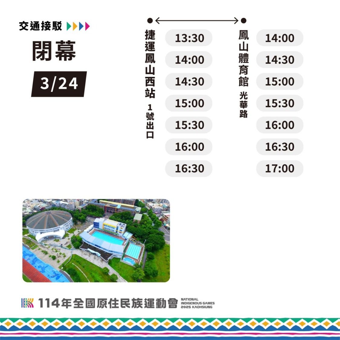 運動發展局表示,接駁站點和時刻表已公布於全原運官網,適合想要觀賽和觀光自由行的民眾規劃運用,賽事期間原鄉及市區部份競賽會場停車空間有限,建議民眾上山觀賽或觀光盡量利用免費接駁車,並請事先上網預約,留意發車時間,詳細免費接駁車資訊請至大會官網(官網主頁>服務資訊>免費接駁車)查詢https://114kaohsiung.khsport.tw/Module/Pages/Index.php?ID=367