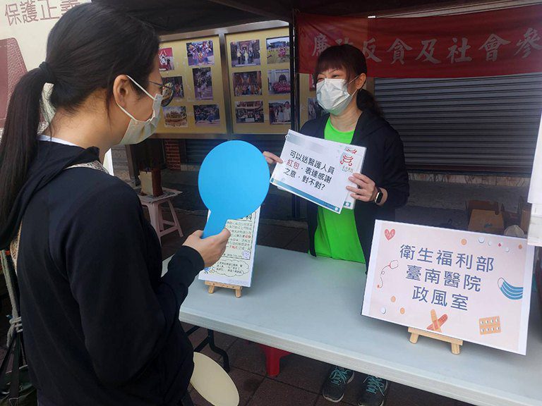 衛生福利部臺南醫院宣導主題結合行政透明、公務員廉政倫理規範、反詐騙、消費者保護、廉政檢舉管道、個資保護法等議題,以快問快答方式,讓民眾手持答題板,一同腦力激盪,挑戰答題速度,並贈送參與者小禮物。