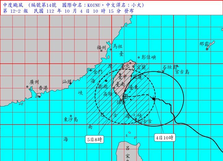 中央氣象署觀測,4日10時颱風小犬的中心位置在鵝鑾鼻的東方約 260公里海面上,以每小時11公里速度向西進行,近中心最大風速每秒 43公尺(約每小時155公里),相當於14級風,瞬間最大陣風每秒 53公尺(約每小時191公里),相當於16級風,7級風平均暴風半徑250公里。