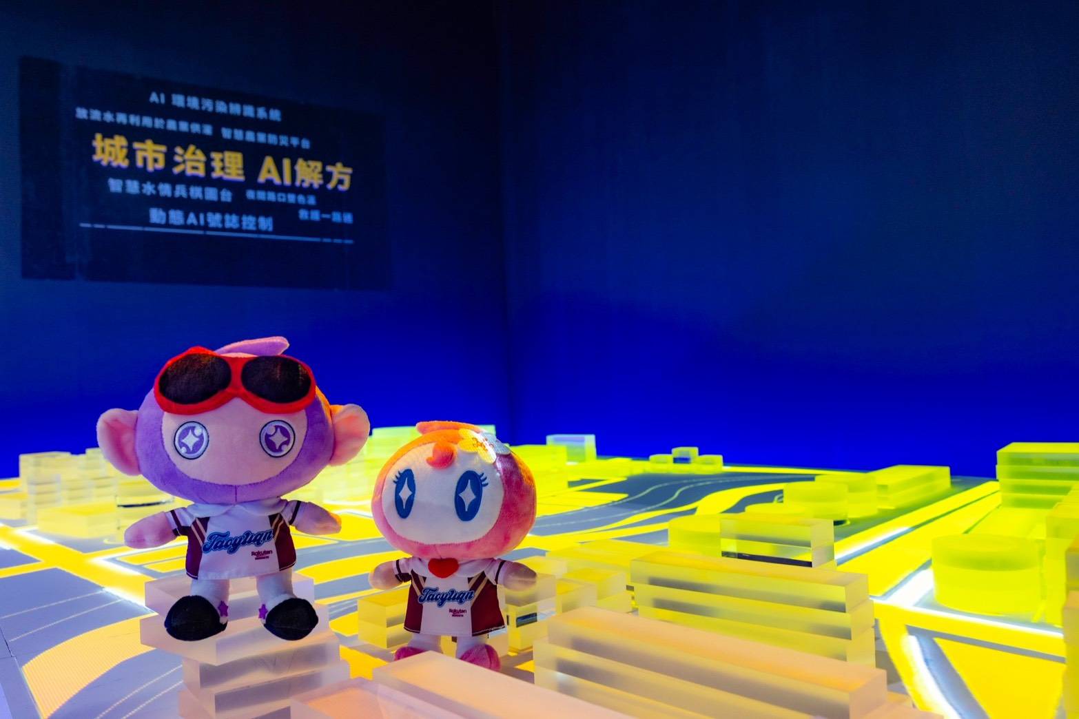 桃園市吉祥物—宇宙版「阿桃」與「園哥」俏皮活力形象深受大小朋友喜愛,這對萌力十足的吉祥物在「桃園AI進行市」驚喜現身與觀眾互動,更特別換上與桃園樂天球隊聯名的限定款球衣,展現活潑、熱血精神,邀請大家來觀展,認識城市中的智慧成果,也與阿桃、園哥共同合影,留下紀念畫面。
