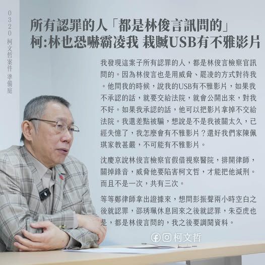 台灣民眾黨前主席柯文哲涉京華城圖利案,遭起訴求刑28年6個月。他20日下午在起訴後首場一審庭火力全開,狂罵民進黨、台北地檢署、鏡周刊是黨檢媒一條龍。柯文哲臉書小編將柯的答辯內容全文速記,昨晚即時在柯的臉書PO出5則發文,內容鉅細靡遺。 柯文哲昨日傍晚5點10分在台北地方法院出庭,審理法官為許芳瑜,書記官徐兆欣、通譯陳彥今。柯文哲委任辯護律師鄭深元、陸正義、蕭奕弘。北檢檢察官為廖彥鈞、林俊廷、黃琬珺等。柯文哲母親何瑞英、妻子陳佩琪、民眾黨主席黃國昌等黨公職均在場旁聽。該準備程序庭從昨日傍晚5點多進行到深夜11點,連續6小時。柯文哲臉書小編在臉書PO出柯的答辯全文如下: 去年四五月,媒體炒作京華城。第一次我有機會完整公開說明。我被收押禁見,不准和外界連絡,已經7個月。沒機會為自己辯護,還要面對特定媒體的抹黑、抹紅、抹黃,更可惡的是用檢調偵查不公開的資料來操作輿論。 但是我內心很坦蕩,我沒有圖利、貪污。我當了30年的外科醫生,都沒向病人收過紅包,怎麼現在會做什麼圖利、貪污、公益侵佔的事? 我們都希望台灣社會團結和諧,但在賴清德“總統”上任之後,“立法院”更分裂對立,吵吵鬧鬧,互不信任。面對這個複雜案子,司法單位很辛苦收集資料,我們要在龐大數據中,做理性的論辯,這不僅是為了公平的司法,這更是社會正義和民主政治的基礎。 去年九月,我被收押,前四個月,我連抗告都沒有,我自認坦蕩,就讓你們去調查,應該很快就會澄清,結果竟然被收押禁見到現在。一直到起訴之後,我讀了起訴書,還有這三個月在獄中看了很多筆錄,才有機會以其他角度檢視京華城案,才恍然大悟,原來檢方是有罪推定,已有既定的立場,根本在羅織罪名而已;配合鏡新聞,一搭一唱的抹黑。 京華城和議員有金流,這個我們不知道,更何況金流發生的時間是在容積率通過之後,當時我們更不會知道,相信除了當事人,也沒人知道,而且金流的事情,和我們也無關。我就明白講,台智光案有議員被收押、有哪個公務員被押!?不是公務員每件事都有關係。 檢方也知道圖利罪實在太牽強,所以一定要羅織行賄的貪污罪,弄出了前金、後謝的罪名。關於210萬,每人30萬,有7個人,共捐了政治獻金210萬給台灣民眾黨,我是在獄中看報紙第一次知道這件事。我從來不知道這件事,也沒人跟我講過這件事。 檢方一開始說這210萬是為了我放水京華城容積率560%,而給的賄款。檢方說109年2月20日,沈慶京和柯文哲兩人在市長室會談,達成期約賄賂之犯意聯絡。既然衹有2人會談,檢方怎會知道我們兩個人在說什麼?你們會通靈嗎? 檢方的證據是朱亞虎的筆錄,因為沈慶京從市長室離開時,面露滿意微笑。沈慶京面露滿意微笑,竟是柯文哲犯罪的證據。 關於本案的處理過程,我有幾個感想: 1.雖然我對於林俊言檢察官有很多抱怨,但是我遇到的司法人員,包括廉政署、“調查局”、台北看守所、地檢署的基層工作人員,都做事認真負責,對我非常友善。在各種場合,還偷偷跟我說“阿伯加油”,有些人不敢喊太大聲,只能比手勢表示加油。謝謝大家對我的支持,尤其是民眾黨和小草們,在這段時間,都能堅守崗位,繼續為台灣努力,我要再次說聲謝謝。 但台北地檢署對本案,真的針對性太強,已經到了濫殺無辜的程度,其實大家也明白,你們的目標是我,但不應傷害這麼多人,我當外科醫生30年,都是在救人,從政以後,也是這種態度,總是能幫忙就幫忙,因此很難想像會有人以害人當作工作。在本案中,幾乎每件事情都作最惡意的解讀來羅織罪名。 關於偵查不公開,司法是國家最後一道防線,應當被人民信任,不應成為政治工具。在本案過程中,鏡週刊的作為讓台灣司法的信任度完全破產。所謂偵查不公開,但鏡新聞可以一而再、再而三的把偵查中的訊息做各種抹黑、抹紅、抹黃。北檢也裝模作樣說要調查,當然是什麼也沒查到,然後鏡新聞可以肆無忌憚,無視社會輿論之批評,甚至固定每星期二發出偵訊中的內幕,配合該週媒體、網路、名嘴之操作。