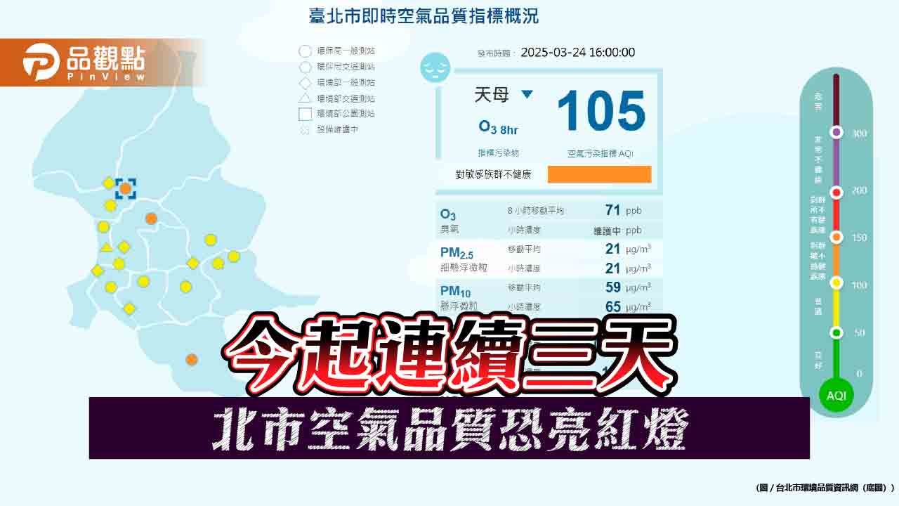 台北市環保局指出,因應今(24)日高壓迴流,環境風場為東南風,西半部擴散條件差,上午部分空氣品質測站已達對敏感族群不健康等級(AQI>100),午後受光化作用影響,下午可能達紅色警戒(AQI>150)。