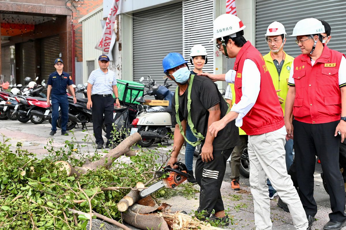 陳其邁市長下午先抵達左營區博愛三路一帶視察,指示工務局儘速清理倒伏的小葉欖仁,排除交通障礙以維護用路人安全;隨後並轉往左營區環潭路及楠梓區後昌路等地視察,關心市區道路清理及市容環境復原狀況,並慰問、提醒辛勞的環保局清潔隊、台電、自來水與工務外包團隊等工作人員需注意自身安全。
