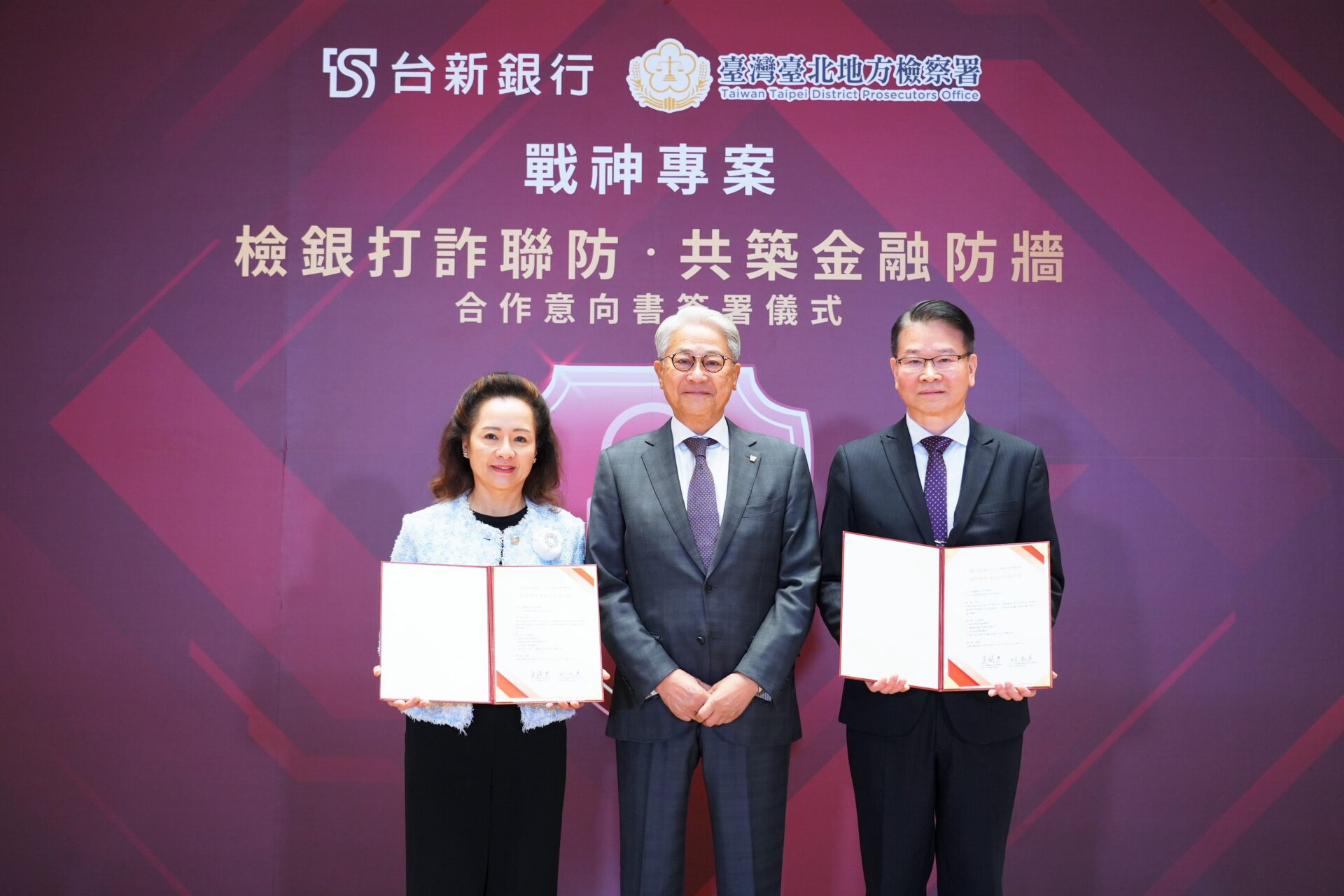 台新銀行今天與臺北地檢署簽署「戰神專案」防詐合作備忘錄(MOU),在台新金控董事長吳東亮見證下,由台新銀行總經理林淑真與臺北地檢署檢察長王俊力代表締結,宣示將透過AI科技,提前預警通報並預控潛在高風險帳戶,共同攜手打擊重大詐騙案件。