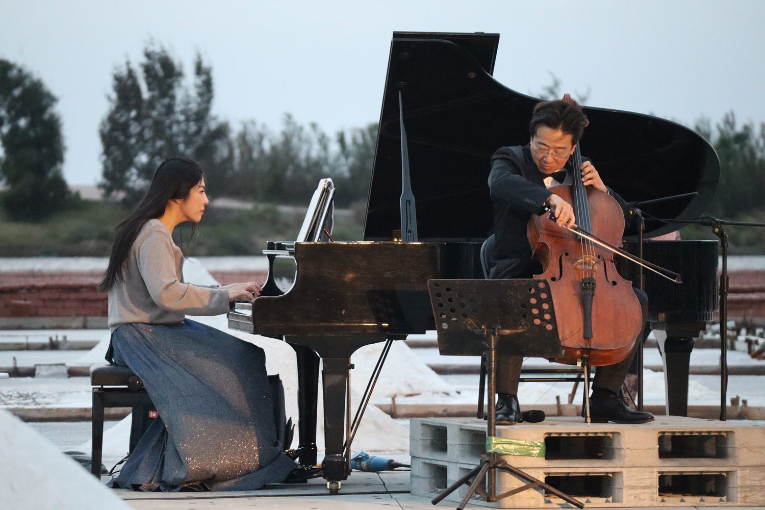 此次音樂會由國際知名大提琴家張正傑領軍「弦外之音」演出,並攜手京劇美猴王朱陸豪、卡門女郎次女高音翁若珮、鋼琴家呂冠葶,共同打造跨界音樂饗宴。最令人矚目的是,主辦單位特別將三角大鋼琴搬進百年曬鹽場,使音樂與鹽田景觀產生奇妙共鳴,讓現場觀眾感受到前所未有的沉浸式音樂體驗。