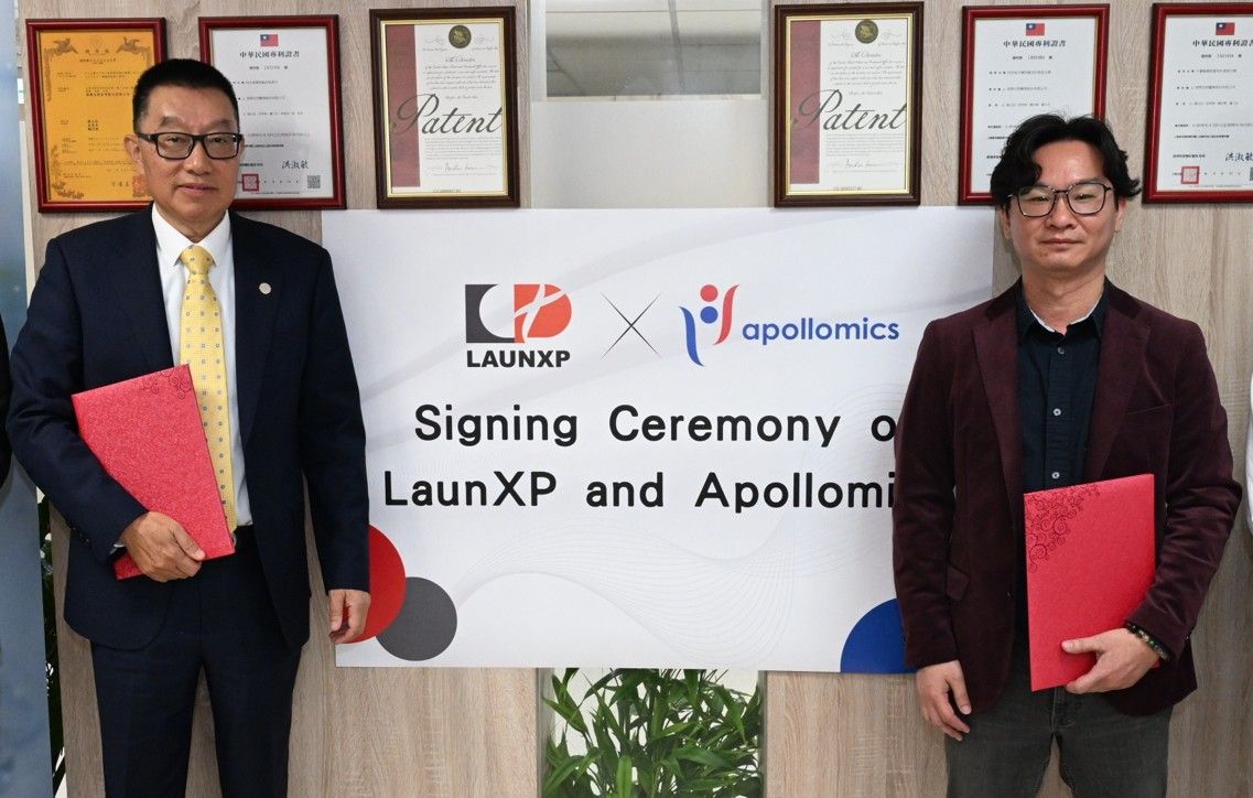 圖/朗齊生醫董事長兼總經理陳丘泓博士(右)代表旗下子公司Launxp International Co., Ltd.,與美國那斯達克上市的生物製藥公司Apollomics執行長余國良博士(左)簽約,雙方將攜手投入亞洲區在非小細胞肺癌(NSCLC)治療的開發與獨家商業化之權利。朗齊生醫/提供