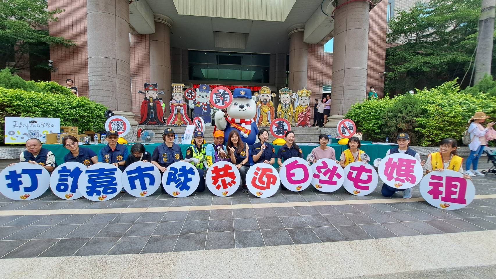 嘉邑大福興宮月老祖廟於10月7日至8日辦理「白沙屯拱天宮媽祖蒞嘉贊境」活動,警察局為持續擴大「識詐」犯罪預防宣導工作,除將200公分高「警察大白熊」大型公仔及5尊Q版神隊友立牌擔任打詐宣導大使外,另製作「警察大白熊歡迎打詐神隊友、打詐嘉市隊恭迎白沙屯媽祖」雙面舉牌,恭迎媽祖蒞嘉贊境及各地信徒前來本市參加活動,以吸引民眾合影及增加曝光率與關注。