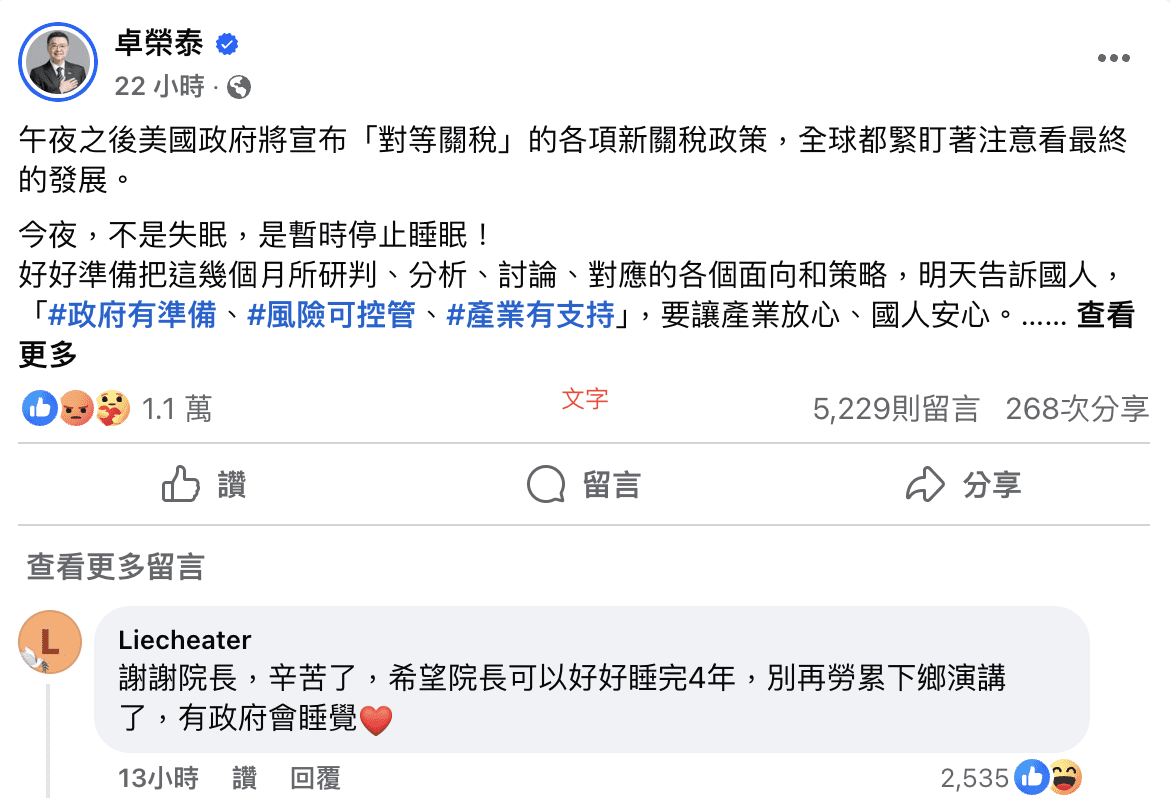 在川普政策正式掀牌後,卓榮泰於3日白天再發出第二篇貼文,主張「美國關稅措施強烈不合理,將與美方嚴正交涉」,但已難平眾怒。許多民眾留言質疑:「睡醒才說要交涉?難怪被課32%」、「只會發文,不會談判」、「你昨天不是說準備好了嗎?結果台積電被重砲打臉」、「快釋憲川普啊」。