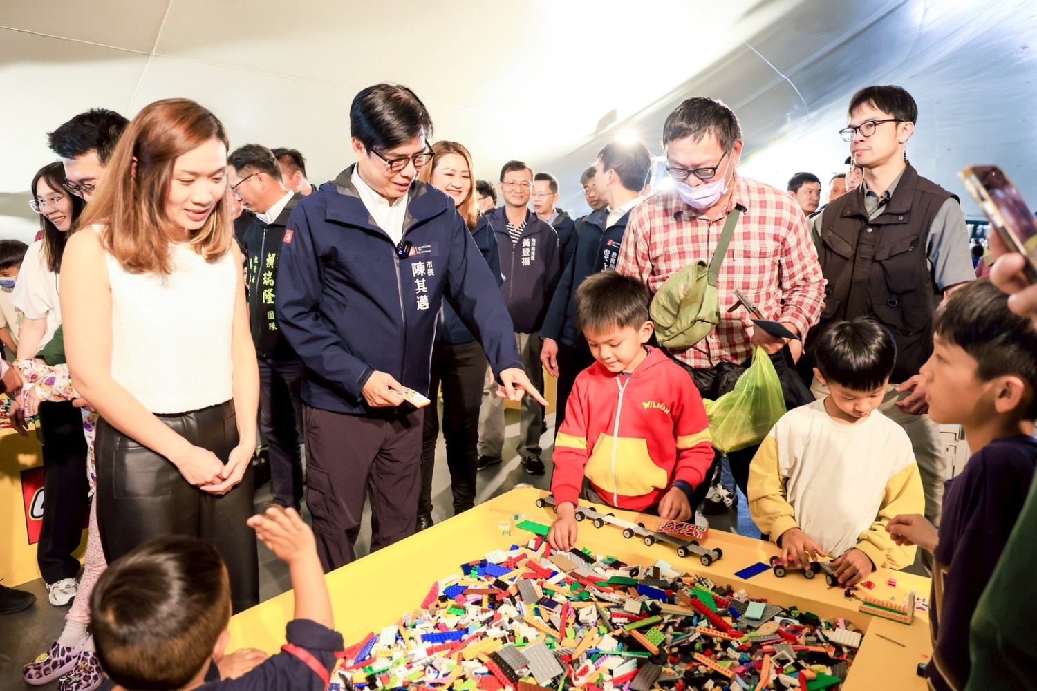 衛武營現場不僅設置6米高巨型衝浪樂高人偶,更規劃多個互動關卡與情境裝置。陳其邁親自體驗「樂高雄 拼砌牆」展現創意,並大玩「玩樂發車」活動,親手拼出有型賽車,享受衝過終點線的成就感。活動現場也發送塗鴉貼紙,大小朋友同樂無間,氣氛熱烈。