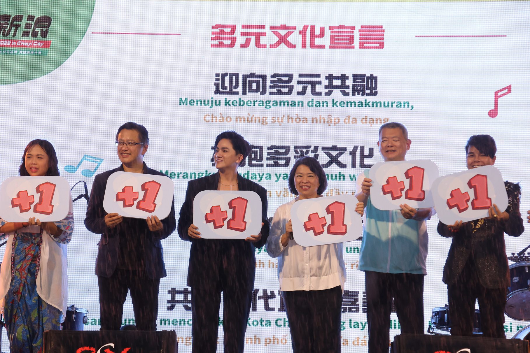 大雨也澆不熄的熱情!嘉義市政府今(7)日下午在中央廣場首次盛大舉辦「嘉城新浪音樂節」,由嘉義市長黃敏惠帶領各界貴賓與台下滿滿的觀眾共同宣誓「多元共融,有我+1」,為活動揭開序幕。音樂節特別邀請來自越南著名歌手庫氏·胡休·阮(Khưu Huy Vũ)及恩天偉(Ân Thiên Vỹ),以及印尼的樂夏Leshia等歌手跨海來台演唱,加上在地團體的音樂舞蹈精采演出,吸引來自各地移民移工聚集觀賞,即使午後下起陣雨,仍不減台下觀眾熱情,台下觀眾跟著歌手一同嗨唱,展現多元文化共融的熱鬧氛圍。
