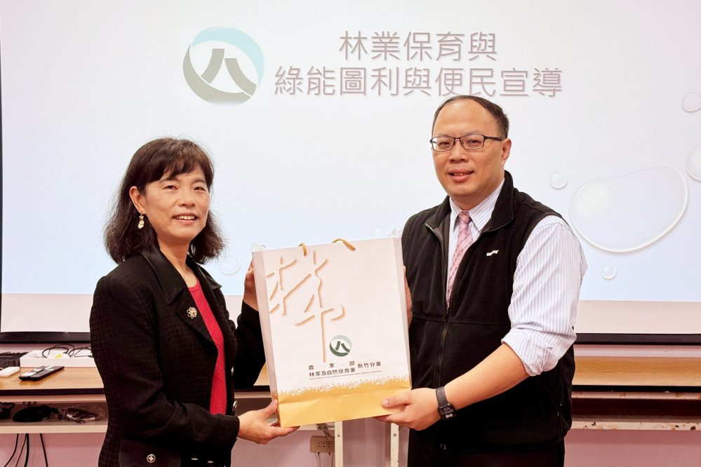▲林保署新竹分署舉辦「114年度林業保育與綠能圖利便民講習」,林保署新竹分署長夏榮生(左)代表機關與范谷良講座進行交流並合影。(圖/林保署新竹分署提供)