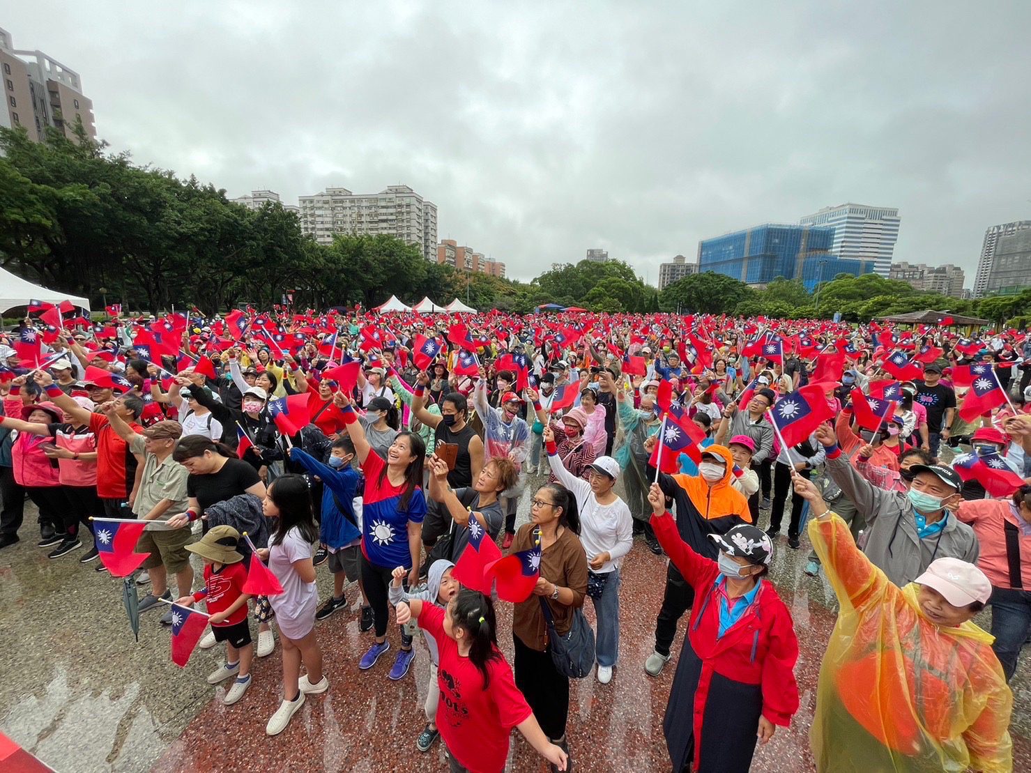 新北市林口區公所今(10日)在林口社區運動公園舉辦國慶升旗典禮,有4千多名民眾揮舞著國旗共同參加,大家唱國歌、看著國旗升起,一起熱情地為中華民國慶生。