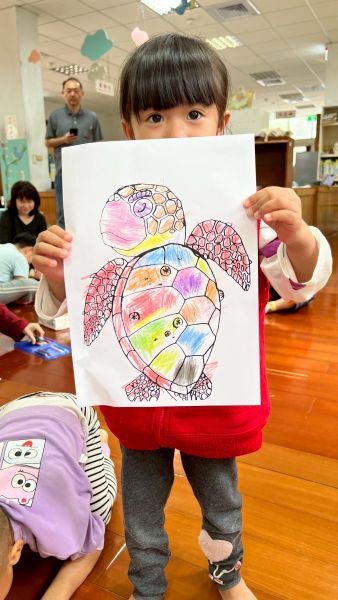 為提升孩子們的參與感,活動中特別安排了小海龜著色橋段,讓小朋友畫出心目中的小海龜,並鼓勵他們表達對誠信與環境保護的看法。